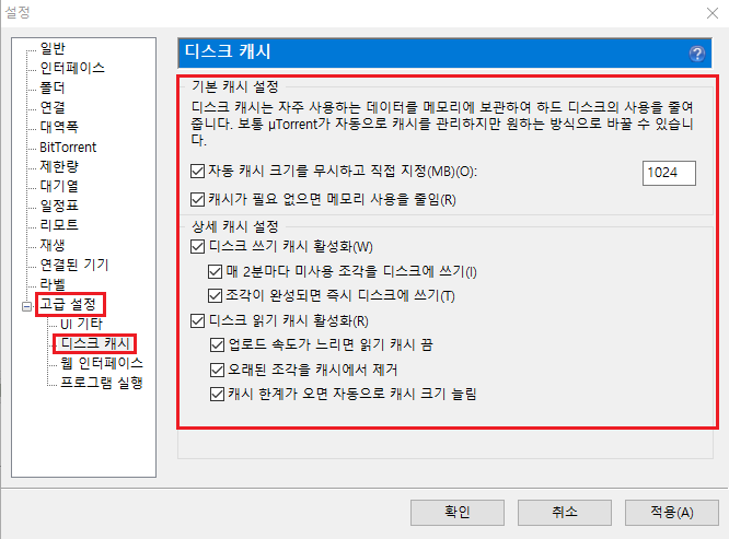 고급 설정의 디스크 캐시