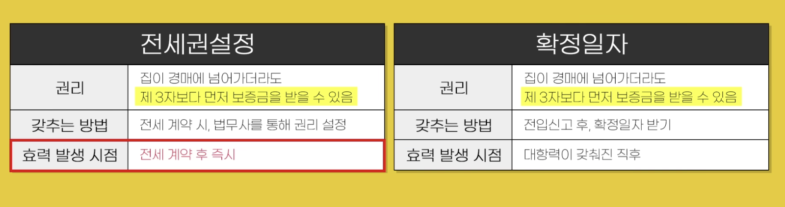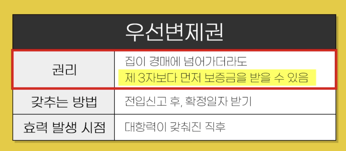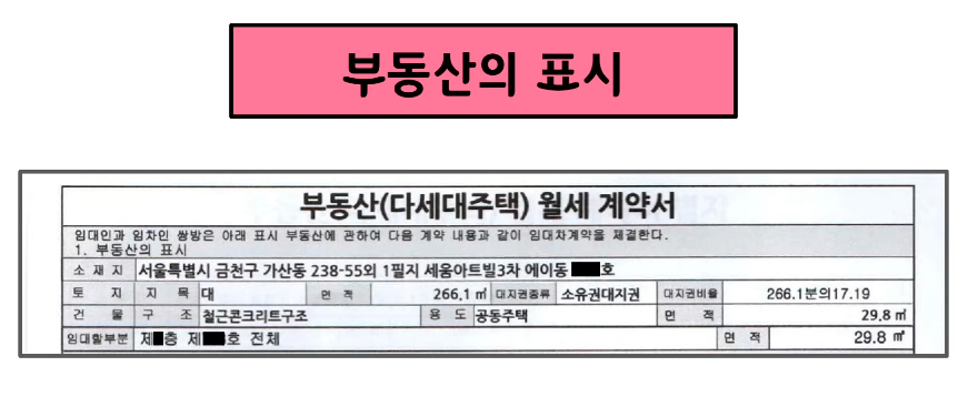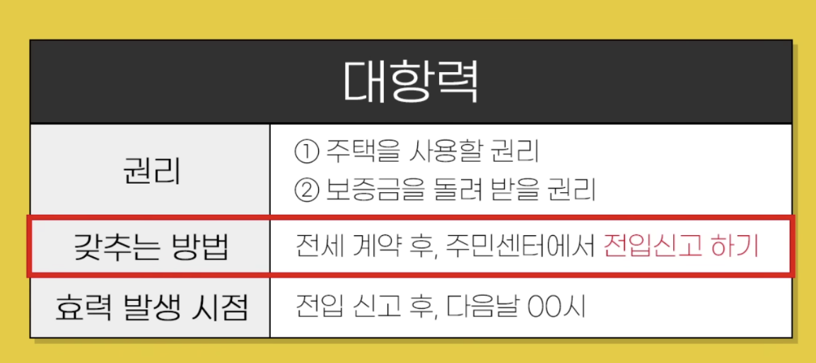 - 전입신고와 확정일자를 받아야 (대향력과 우션변제권이 발생) 및 임대차 계약서 법률상 인정이 된다.