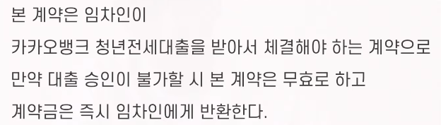 - ‘본 계약은 전세자금 대출 계약이며 임대인과 임차인은 이에 대해 협조하고, 전세자금 대출되지 않을 경우 계약은 해지되며 계약금은 반환하도록 한다(임차인의 단순 변심 경우는 제외).’