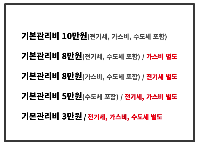 - 3.공과금 : 수도세 + 난방비 + 전기세 ( 기본관리비에 포함될 수 있음 )