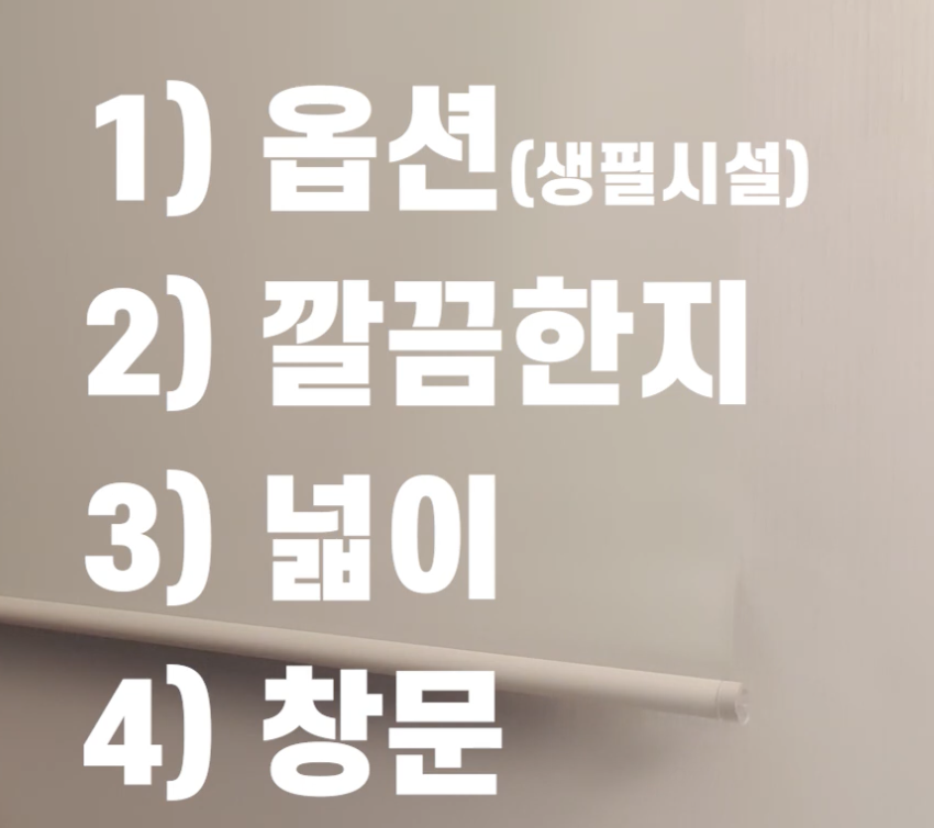 화장실 : 창문 없으면 하수구 냄새 올라옴 / 하수구 냄새 많이 나는지 확인 / 오래된 건물 고층은 수압이 낮을 수 있음 / 정상적인 보일러로 30초 안에 온수가 나와야 한다. /