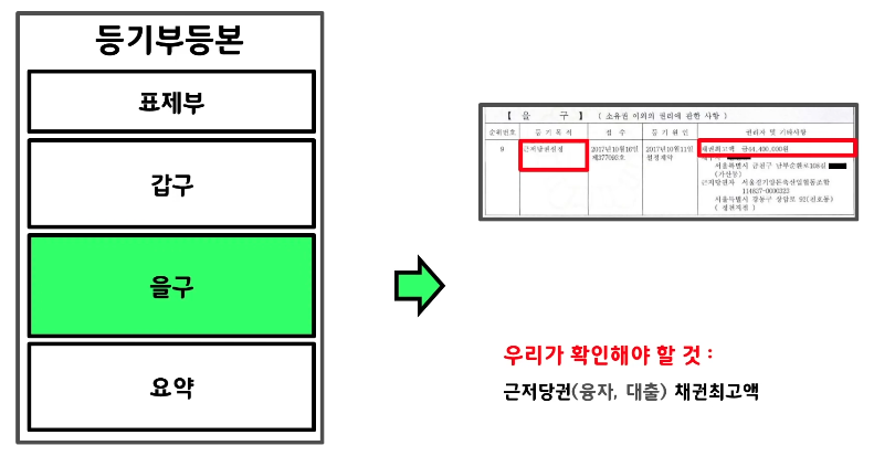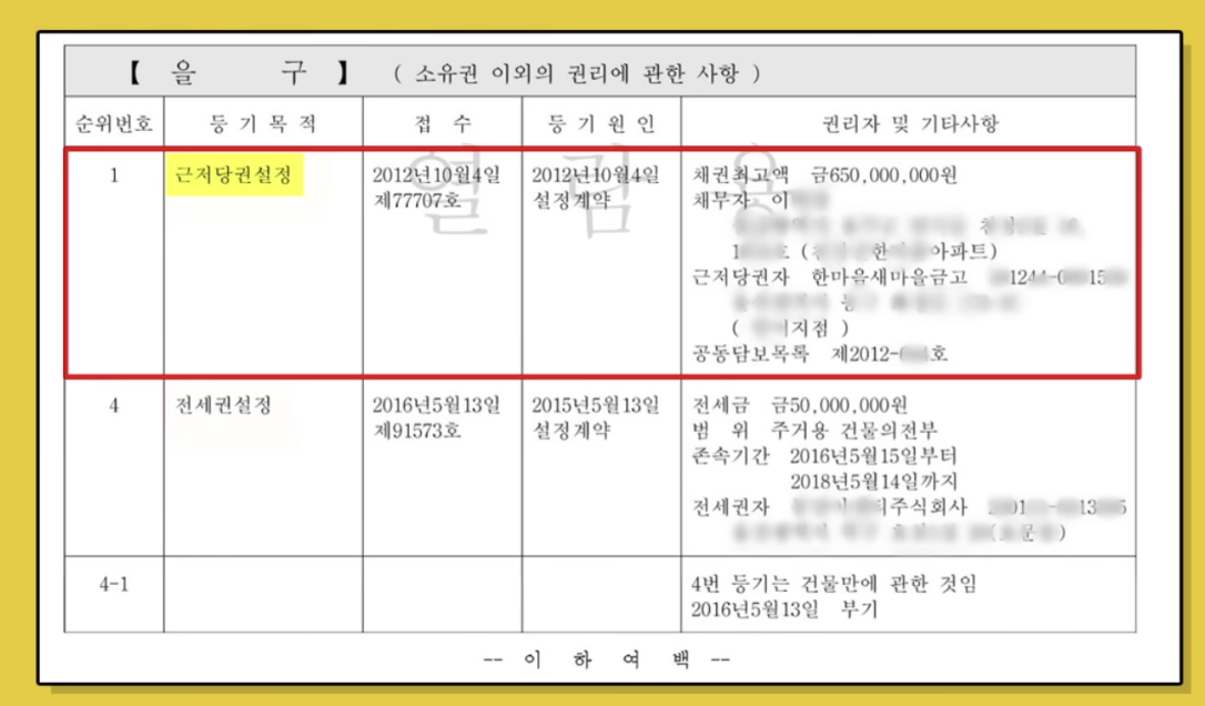 집주인이 집을 살 때, 은행 대출을 낀다면, 은행에서 근저당권을 등기부등본에 기록해 준다.