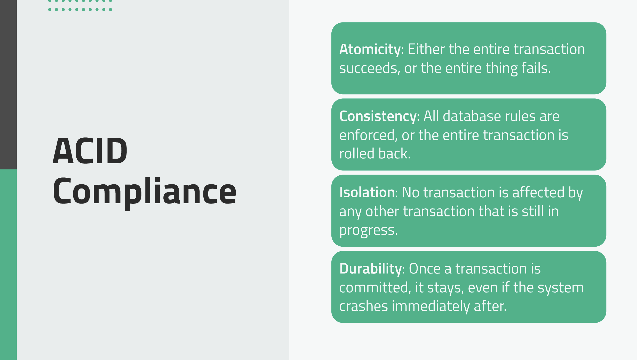 C 일관성 : 특정 필드는 음수가 절대 될 수 없음 등의 일관성, 그런 값이 들어간다면 롤백되어야 함