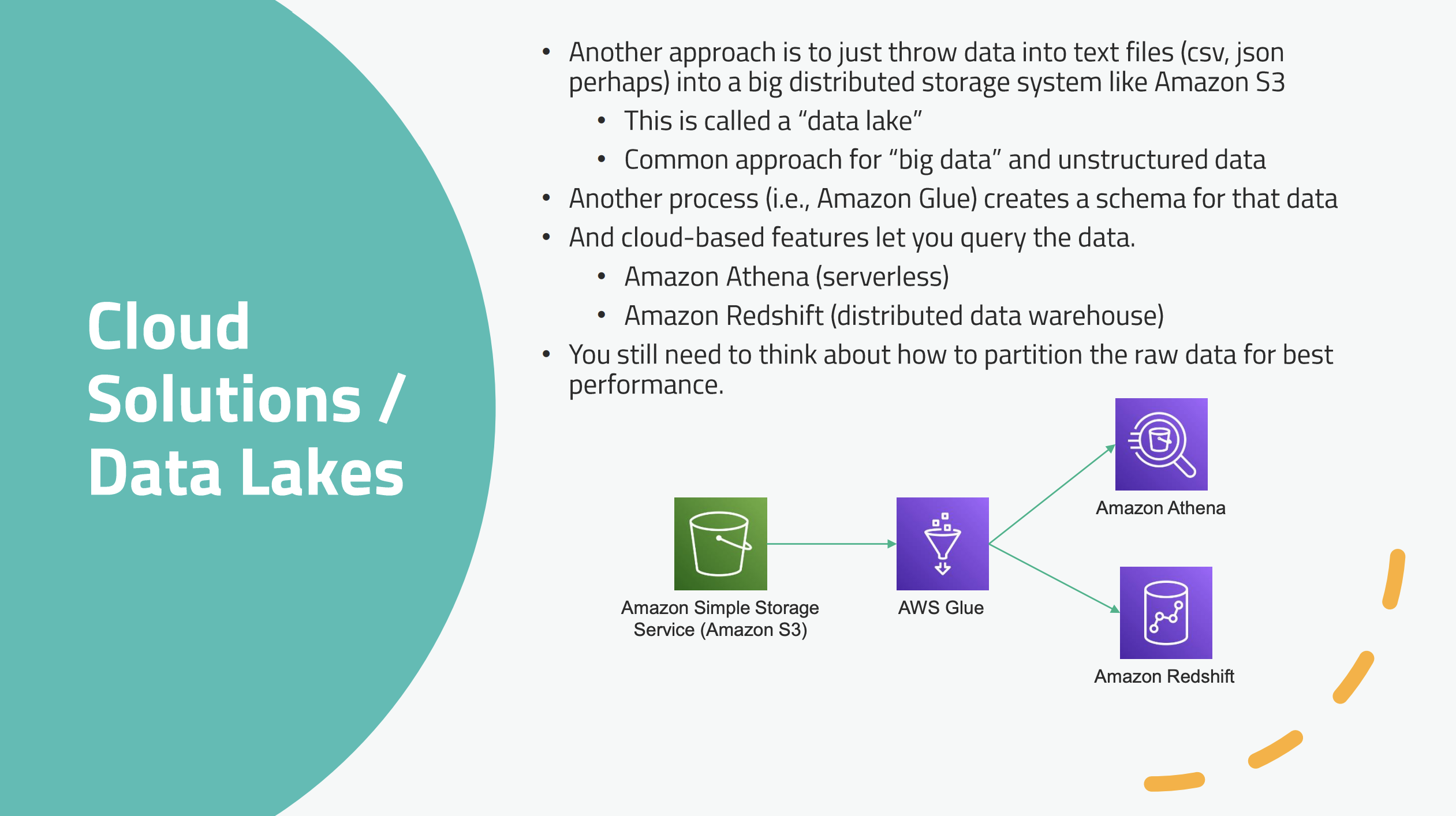 데이터 레이크 : CSV, JSON 등 미가공상태의 대량의 데이터를 S3와 같은 버킷에 담아두는 것